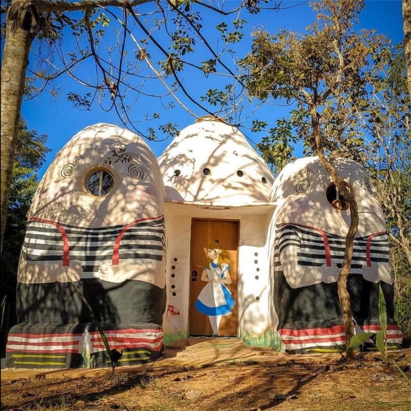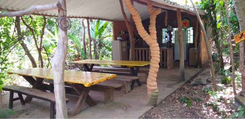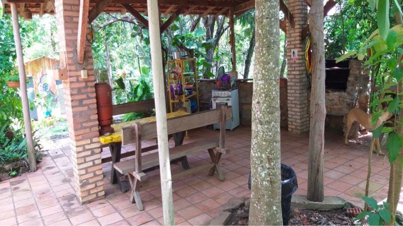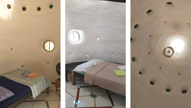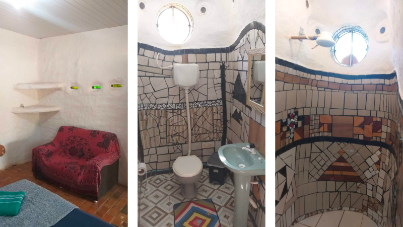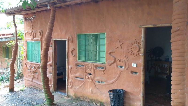 Estrutura bioconstruída em Pau a Pique ou Ecodomo bioconstruído com tijolo adobe, cama de casal, branheiro privativo, ar-condicionado.
